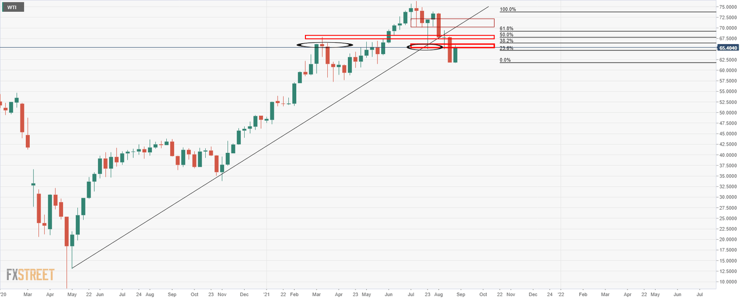 - WTI bulls take on the confluence of the daily and weekly 50% and 38.2% Fibos.