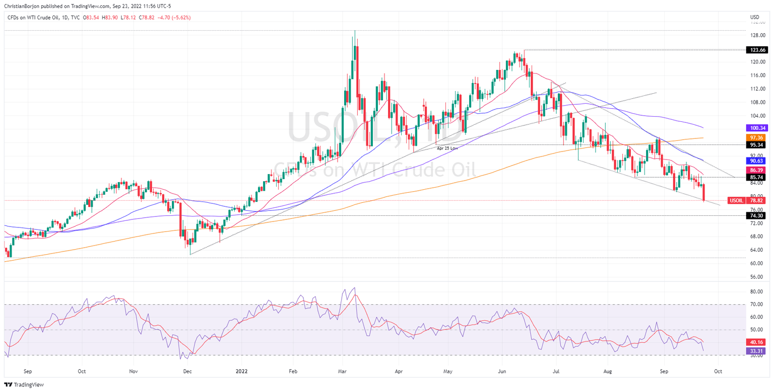 The US crude oil benchmark, also known as WTI, drops below $80.00 per barrel on Friday, amid a buoyant US Dollar, with the US Dollar Index rising to levels last seen on May 2002, a headwind for the US dollar-denominated commodity. Therefore, WTI is trading at $78.80, below its opening price by almost 6%, after hitting a daily high of $83.90.
