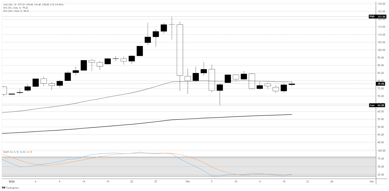 Spot Silver prices are trading just below the flattening 50-day Exponential Moving Average (EMA) at 79.22, which is acting as near-term resistance, while the 200-day EMA at 58.03 sits far below, confirming the broader uptrend remains in place, albeit waning. The recovery from the February 6 low at 64.08 has been choppy, with Silver reclaiming roughly half of the losses from the late-January spike before stalling into a range of small-bodied candles and doji around the 75 to 85 zone over the past two weeks.