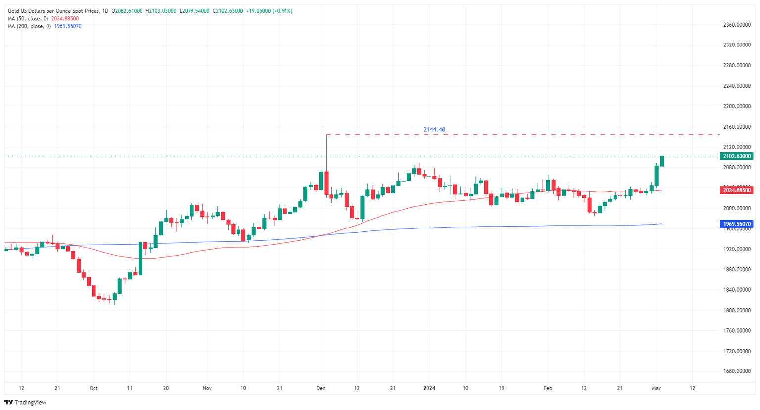 Spot Gold is extending last Friday’s gains, tipping over the $2,100.00 handle in the early week’s trading. XAU/USD is up over a full percent bottom-to-top on Monday, and intraday bids are accelerating into the high end away from the 200-hour Simple Moving Average (SMA) at $2,038.89.