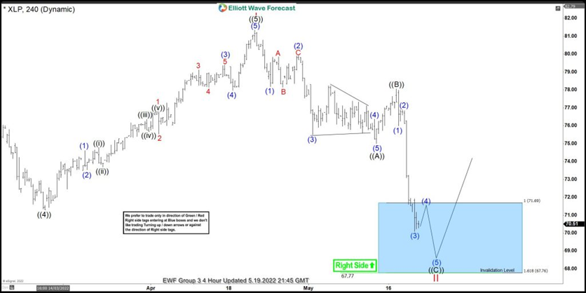 Here’s Elliott wave Chart of XLP from the 5/19/2022 update. In which, the rally to $81.34 high ended the cycle from the 23 March 2020 low & made a pullback. The internals of that pullback unfolded as Elliott wave zigzag structure where wave ((A)) ended in 5 waves at $75 low. Then a bounce to $78.05 high ended wave ((B)) & started the next leg lower in wave ((C)) towards $71.69- $67.76 blue box area. From there, buyers were expected to appear looking for new highs ideally or for a 3 wave bounce minimum.