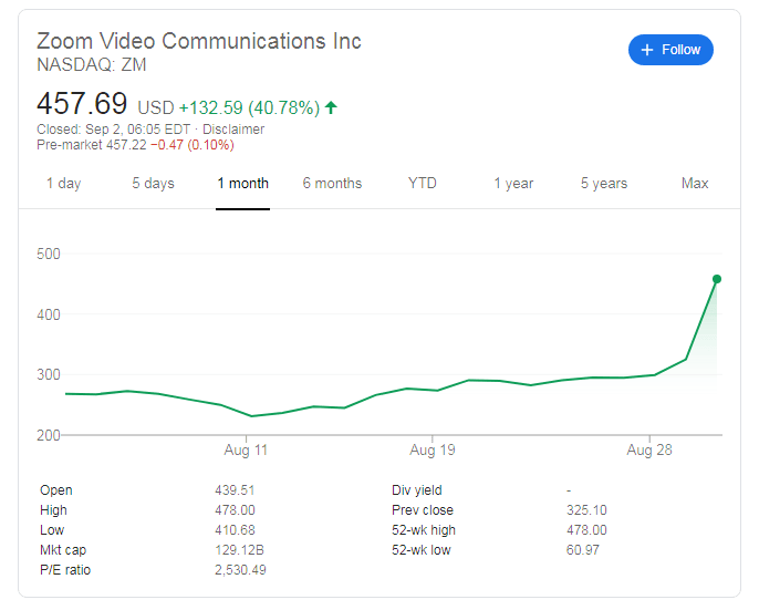 - NASDAQ: ZM has jumped by over 40% to $457 after smashing earnings' estimates.