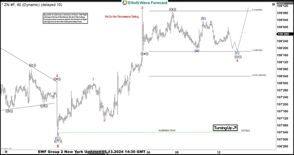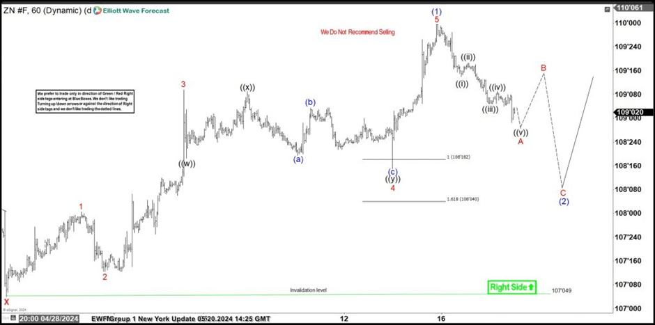 In the medium term, we anticipate that $ZN_F could develop into a double zigzag structure from the low of October 2023 in the cycle degree. From that low, wave W of the double zigzag began and ended in the high of December 2023, where wave X started. Wave X concluded on April 25, 2024, followed by the start of wave Y. By projection, wave Y should potentially break above the December 2023 high where wave W ended. With this in mind, we started updating 1-hour charts for elliottwave-forecast.com members from the low of April 25, 2024. In the near term, a bullish sequence emerged from the April 2024 low. We identified this sequence as an impulse wave completing wave (1) of ((A)) of Y.