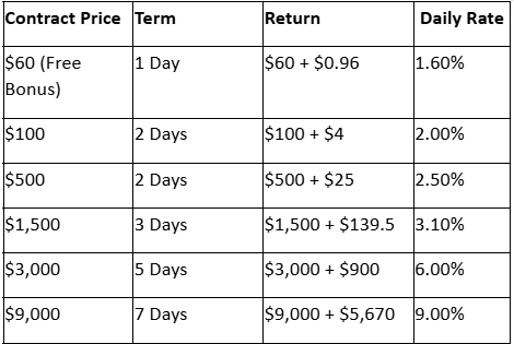 In only two days, the $100 contract produces a guaranteed return of $4—equal to a daily rate of 2%. Earnings are processed automatically and credited to your account every 24 hours, with no hardware to set up or maintain.