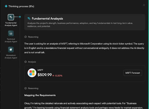 Ask Edgen what’s driving Microsoft, and you won’t just get a neat line about “earnings momentum” or “AI growth tailwinds.” Instead, users will see the technical analyst noting a breakout pattern, the fundamental agent weighing revenue expansion against margins, the sentiment tracker flagging chatter around product launches, and the macro lens highlighting bond yields. Each thread is visible, clickable, traceable back to its source.