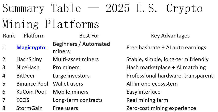 Based on this direction, we assessed platforms through compliance, real earnings performance, AI hash optimization, security level, user reputation, and U.S. availability, and compiled the Top 8 free and trusted AI mining platforms for 2025.