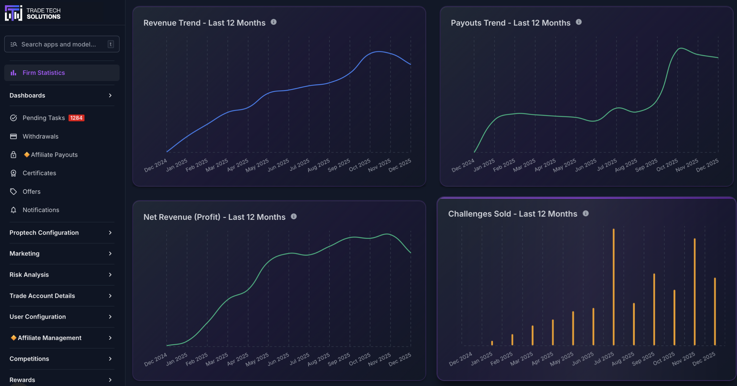 Trade Tech Solutions is a prop firm technology provider founded in 2023. The company delivers end-to-end infrastructure for more than 70 prop firms operating in forex, CFD, crypto and futures markets. The platform covers evaluation programs, advanced risk tools, automation, affiliate management, CRM integrations, payment connections and detailed risk reports.